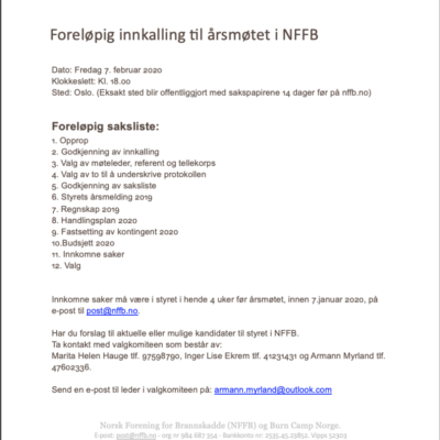 Lørdag 08.02.2020 ble det avholdt årsmøte i NFFB på Thon Opera, Oslo. Det nye styret består av leder Monica Hansen og styremedlemmene Kenneth Wangen, Rune Kløvtveit, Øystein Stokvik Malme og Mariann Kleven. Bente Fidje gikk ut av styret og vi takker for innsatsen hun har lagt ned i styret gjennom mange år. Valgkomiteen består av […]